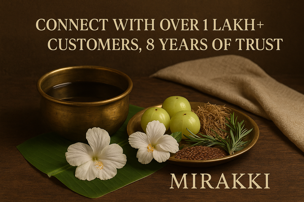 Powered by time tested Ayurvedic ingredients like Onion, Amla, Bhringraj, Hibiscus, many powerful roots, Mirakki's haircare ritual has helped thousands of men and women combat  hairfall, boost hair growth,  and restore scalp health naturally. Handcrafted in small batches, our oils and shampoos go beyond cleansing, they transform your hair from the root up. Experience the ritual that India swears by.